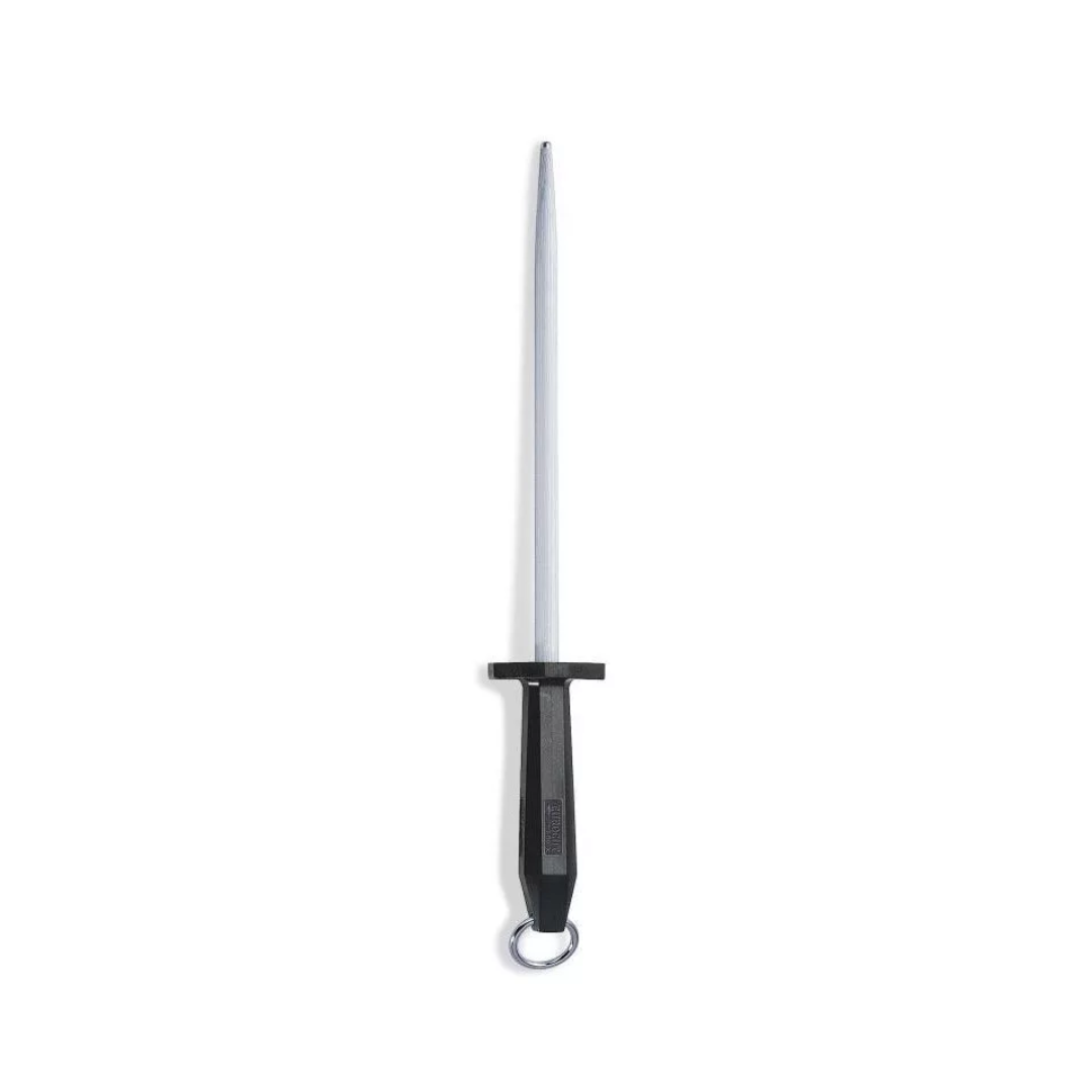 FISKARS-DICK oštrač noževa, okrugli 30 cm profesionalni je alat namijenjen redovitom održavanju oštrine mesarskih, kuhinjskih i radnih noževa. Okrugli profil omogućuje ravnomjerno poravnavanje oštrice i održavanje optimalnog kuta rezanja. Redovitom uporabom oštrača produžuje se vijek trajanja noževa i osigurava precizan i siguran rad. Oštrač je izrađen od kvalitetnog čelika koji omogućuje učinkovito i pouzdano održavanje oštrine noževa. Duljina od 30 cm posebno je pogodna za rad s većim noževima poput mesarskih ili profesionalnih kuhinjskih noževa. Ergonomska drška omogućuje stabilan i siguran hvat tijekom oštrenja, čime se povećava sigurnost i kontrola rada. FISKARS-DICK okrugli oštrač noževa idealan je za profesionalne mesare, kuhare i sve korisnike koji žele održavati noževe u vrhunskom stanju.